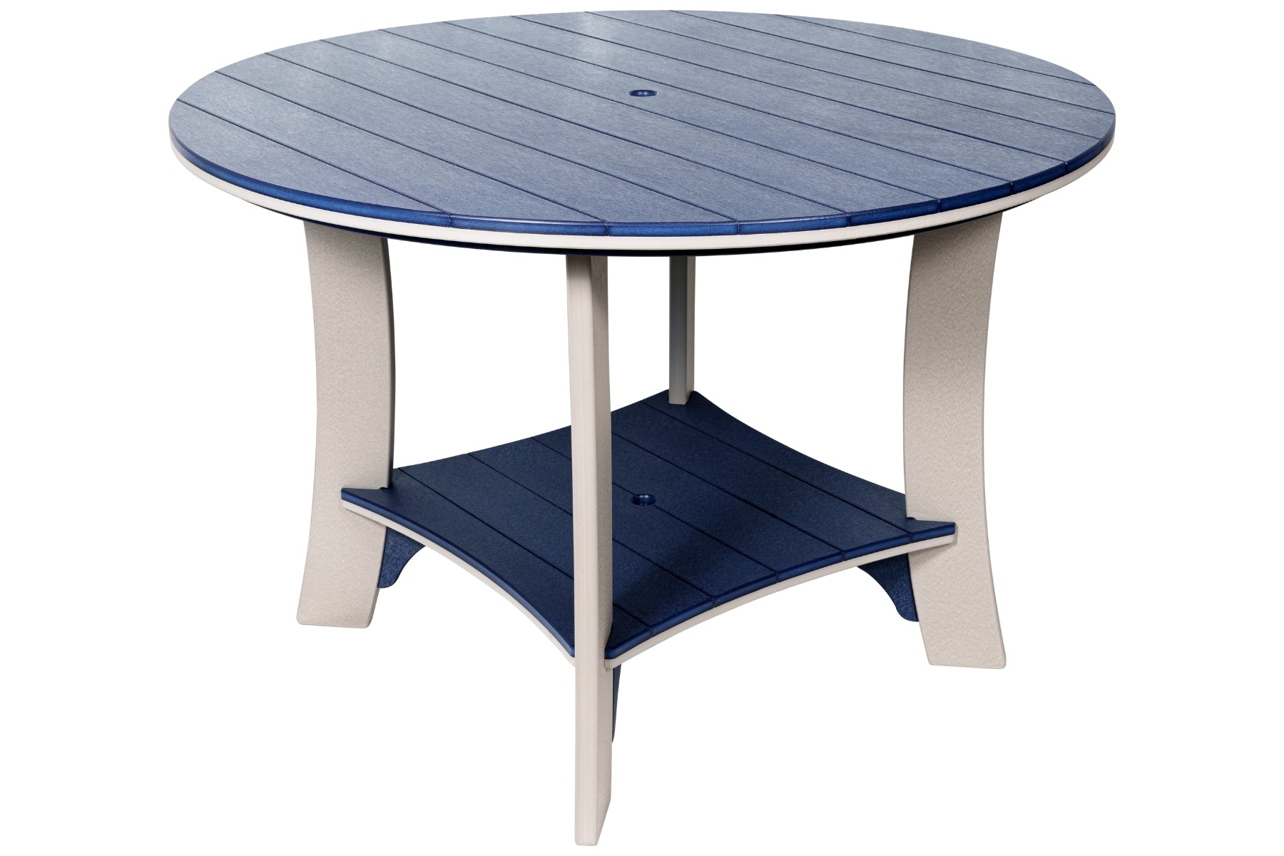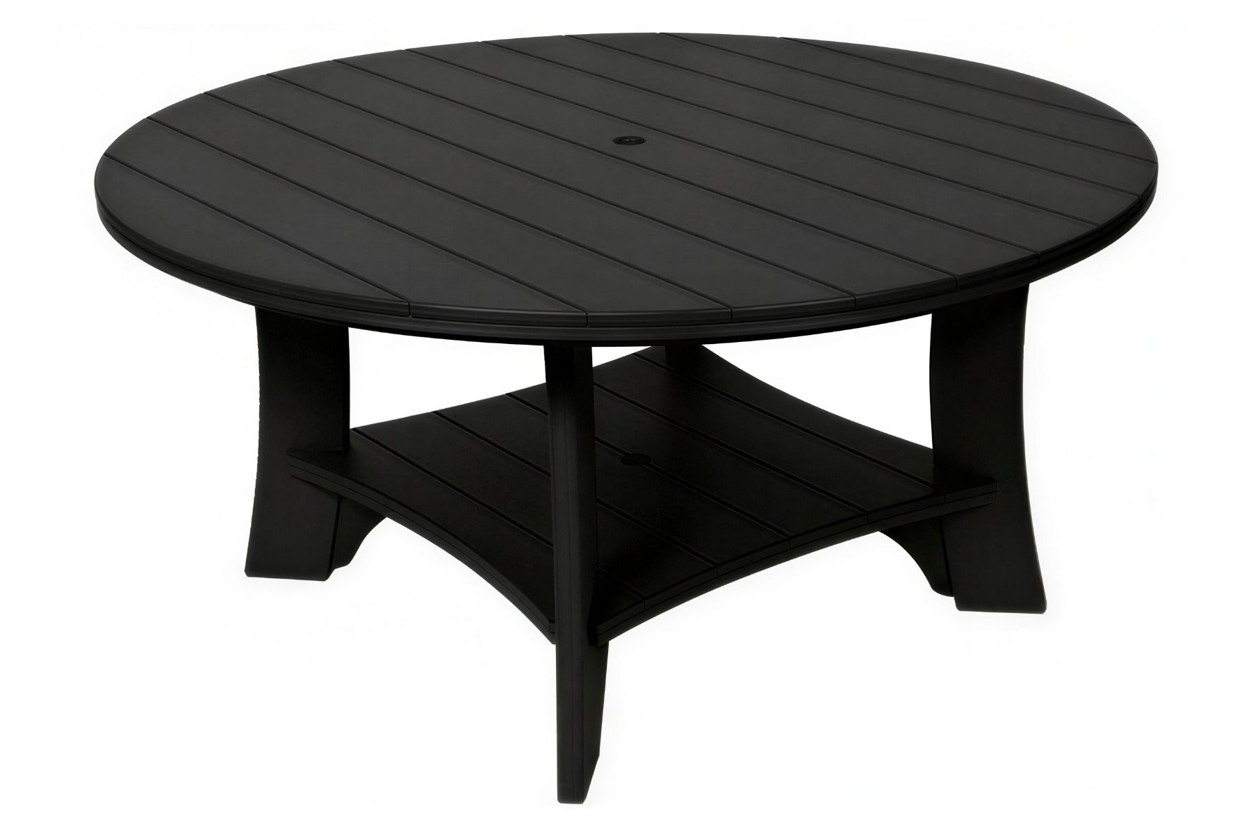 It's a big poly table! The 60" Serenity Round Table can comfortably accommodate any 6 chairs, and can fit up to 8 chairs without arms. This 60" round poly table offers the perfect blend of spaciousness and durability for low-maintenance, all-weather outdoor dining.