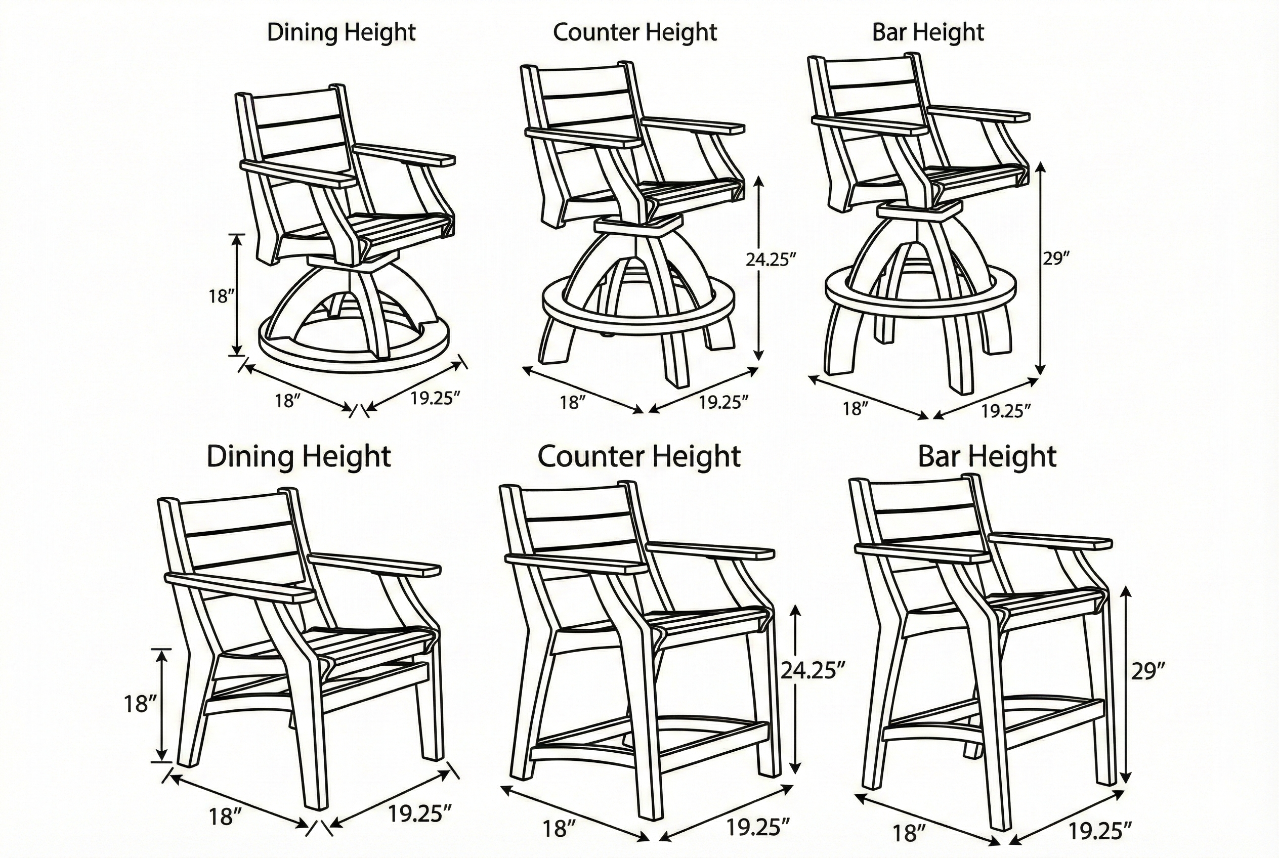 - Dining Height Table: 44"x44"x29"