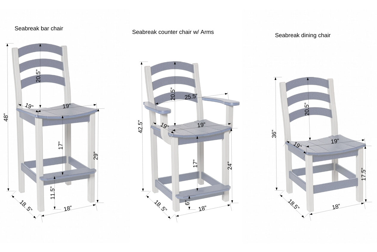 The Seabreak chair by Beaver Dam has an ergonomically curved seat. This versatile chair is available with or without arms in 3 different heights. Great as a standalone item or to pair with a table.