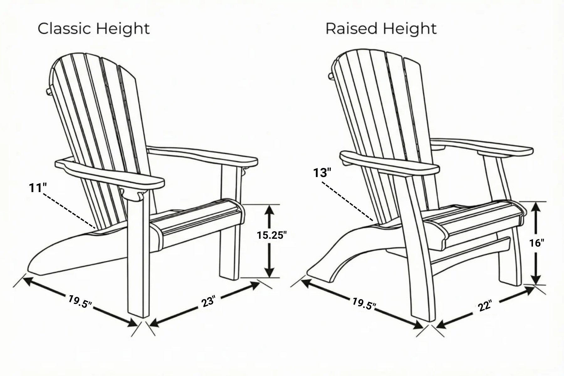 - Classic: 11" from ground to back of seat
